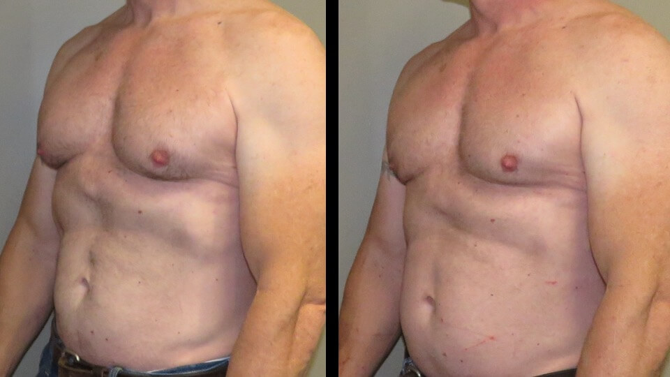 He is seen here 8 months after reduction of gynecomastia with ultrasonic liposuction of fat and direct excision of breast tissue through a periareolar incision. He also had liposuction of the abdomen and love handles at the same time.