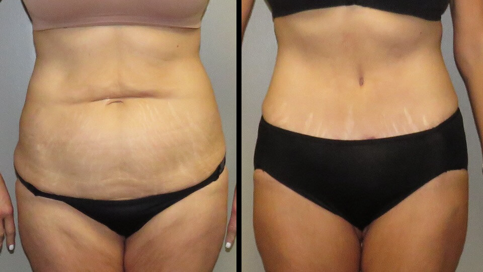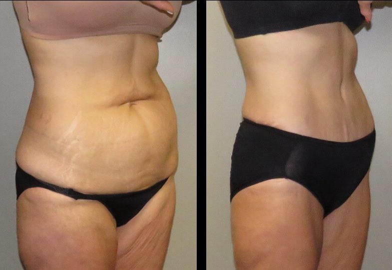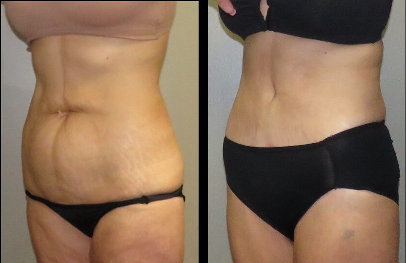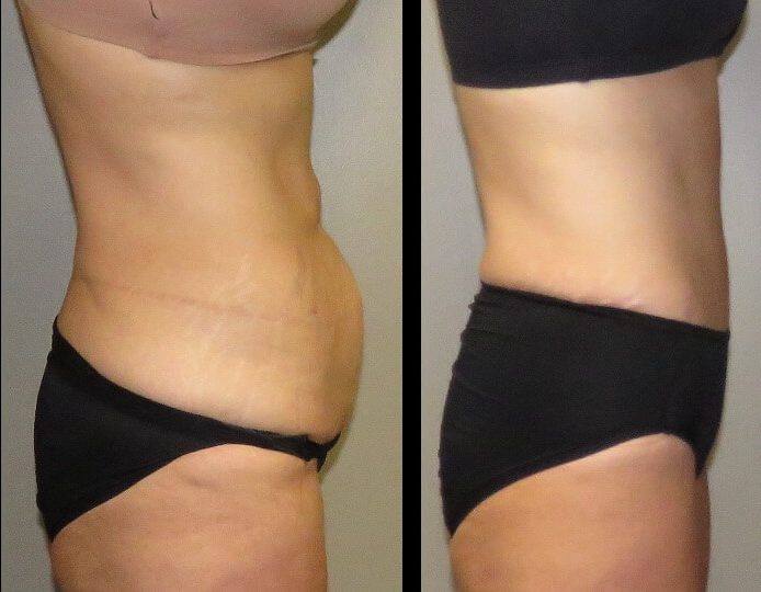 This is a 40-year-old woman who experienced an 80-pound weight loss and requested rejuvenation of her tummy. She is seen her 3 months after liposuction of the abdomen with skin removal and umbilical transposition.